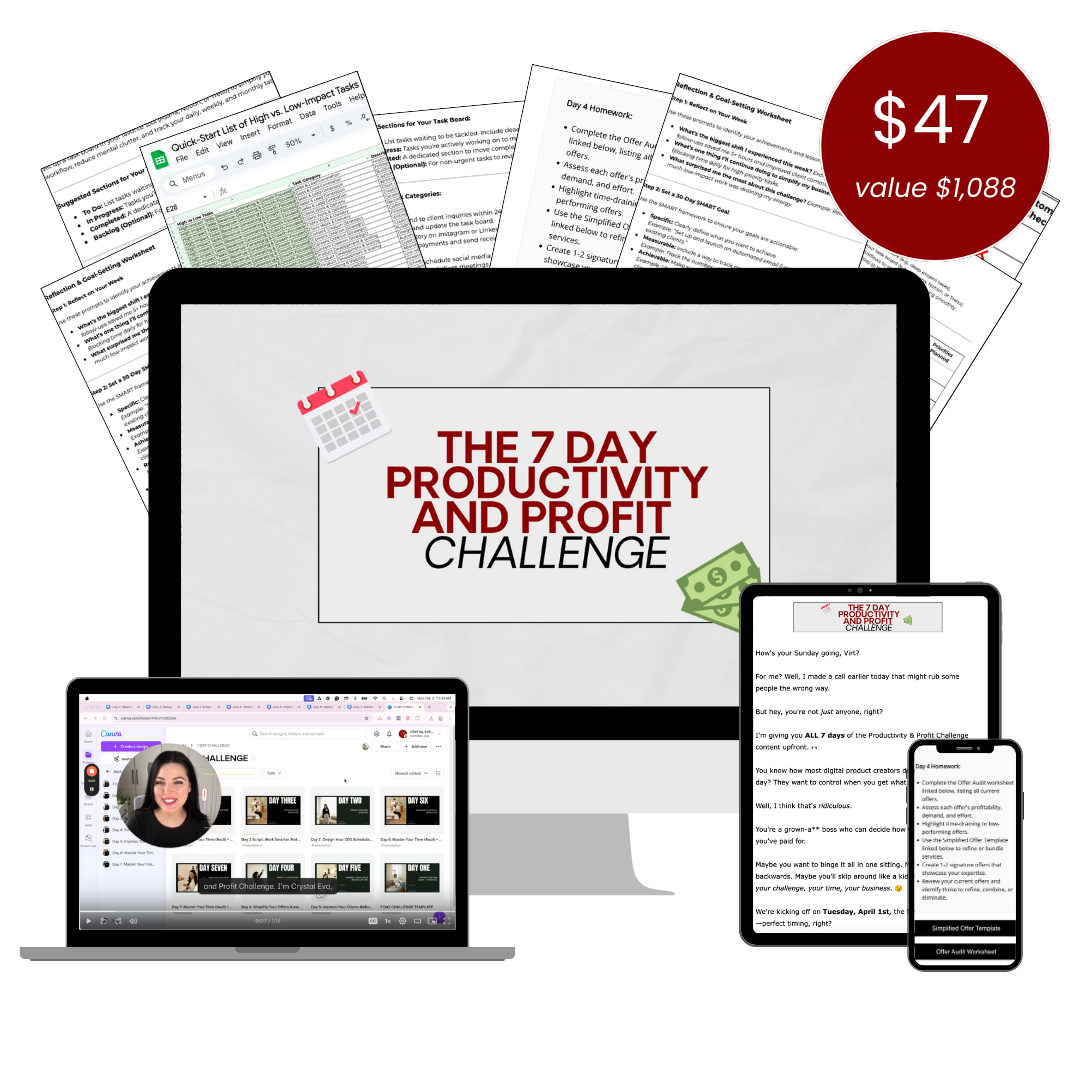 OR you can get The 7-Day Productivity & Profit Challenge that condenses everything I learned into bite-sized, 10-minute daily action steps that will transform your business by this time next week.
